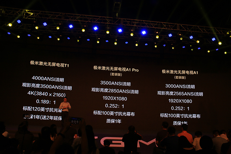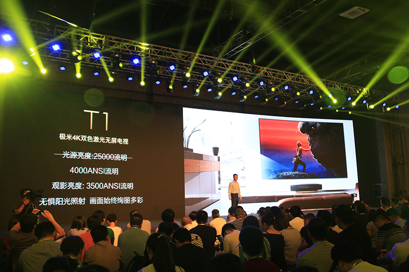【2017年7月25日 智能公会 北京报道】无屏电视开创者极米科技召开发布会,推出全球首款120英寸4K双色激光无屏电视T1、100英寸1080P激光无屏电视A1 Pro和A1,三款产品价格分别为79999元、29999元和22999元。极米激光系列产品的面世,将激光无屏电视的产品品质和用户体验提升到全新高度,其中T1不仅以史无前例的配置成为行业内亮度最高、色彩最好、投射比最好和音质最好的激光电视,更让激光电视突破局限,成为无时无刻都能融入居家生活场景的品质生活载体。