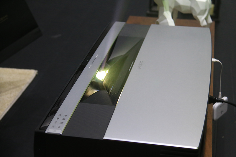 激光无屏电视和抗光幕布是天生一对,T1标配120英寸抗光幕布。抗光幕布不仅可以有效降低环境光对画面的干扰,让画面色彩始终如一,同时还能提升画面对比度,并避免由墙面不平整造成的画面扭曲。此外,T1投射比为0.189:1,是目前市面上投射比最好的激光电视。用户无需改变客厅格局,只需将T1放在电视柜上,保持机身距离墙面约18cm就能投射120英寸画面。