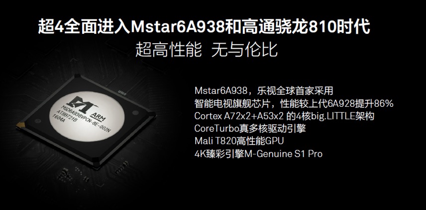 据悉,超4 X50 Pro/超4 X50/超4 X50中超版尺寸均为50吋,采用最新、最强的智能电视旗舰芯片Mstar6A938,3GB超大运行内存+16/32GB eMMC5.1高速闪存,和上一代Mstar6A928相比,性能提升86%,为超快体验打下重要基础。Mstar6A938是4核1.7GHz 64位处理器,采用目前最新的2核Cortex-A72 CPU和2核A53 CPU搭配架构。A72是ARM性能最出色、最先进的处理器,因而Mstar6A938也是电视产业第一颗采用A72核心的芯片,而A53是世界上面积最小的64位处理器。最高性能的ARM CPU核心与最高效的ARM CPU核心相结合,做到根据不同运算需求随意切换内核,瞬间提供运算能力,在多个并行应用场景下,实现真正的快体验。