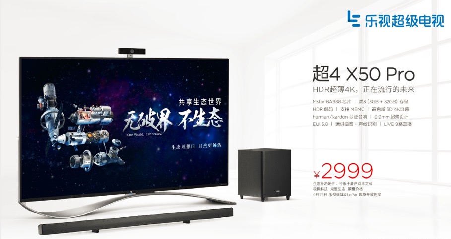 发布会上,乐视首先基于全球独创的开放闭环乐视生态系统,推出生态电视——第4代超级电视X50 Pro(超4 X50 Pro),定价2999元;超4 X50,定价2499元,超4 X50中超版,定价2699元。这三款产品均可低于量产成本定价,通过生态补贴硬件,引领电视行业步入硬件负利时代。据悉,三款产品尺寸均为50吋,9.9mm金属超薄机身,并采用最新、最强的智能电视旗舰芯片Mstar6A938,3GB超大运行内存+16/32GB eMMC5.1高速闪存,支持MEMC动态画质处理和HDR等技术。