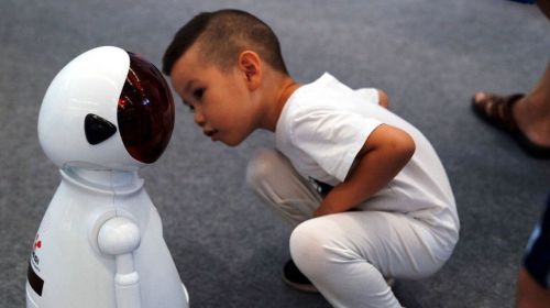 2016年8月27日,在天津?世界侨商名品博览会上,小朋友与智能家居机器人小智互动。据介绍,这款智能家居机器人具有代替门禁、紧急救助、监控、安防、智...